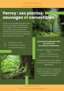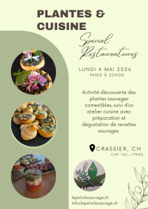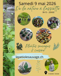Prix de l’activité: 80.- par participant incluant l’aller et retour en train (1ère classe), une surprise à l’aller, l’encadrement lors de la balade avec les explications de certaines plantes, l’apéro préparé à base de plantes sauvages.