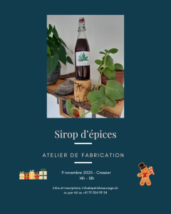 L’activité se déroule dans un appartement chauffé et spacieux. Nous fabriquerons ensemble le sirop en intégrant toutes les étapes depuis la prépartion des épices jusqu’à la mise en bouteille. Chaque participant repartira avec une bouteille et la recette de ce nectar. Un goûter vous sera servi en milieu d’atelier.