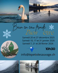 Et si cette année tu te lançais un défi bien-être ? As-tu déjà entendu que le froid peut être bénéfique pour notre santé ? Le Pétiole Sauvage te propose de te mettre à l’eau, en conscience afin de profiter des nombreux bienfaits que peut t’apporter cette pratique à la portée de tout le monde (ou presque). Intéressé(e) ? Peut-être que certaines peurs te retiennent et c’est normal. Avant de rentrer dans l’eau, un espace de discussion est là pour poser les choses. Nous pouvons aussi pratiquer une méthode de respiration qui nous aide à rentrer dans l’eau en étant préparé à accueillir le froid. Et parce qu’en groupe c’est plus sympa, tu es le(la) bienvenu(e) pour nous accompagner dans cette activité. Des questions ? Des craintes ? Je suis là pour y répondre et me rend disponible pour en parler. L’idée est de se baigner dans différents lieux de Suisse Romande, et c’est important de t’inscrire pour chaque date proposée selon tes possibilités et tes envies.